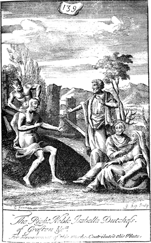 Description: Eliphaz the Temanite, Bildad the Shuhite, Zophar the Naamathite, and Job engage in discussion as to why these unfortunate events happened. A demonic figure is depicted tormenting Job as they speak. The names of the artist, G. Freman, and the engraver, Johannes Kip (1653-1722), have been set at the base, and as the numeral at the head of the page indicates, this is plate #139 in a series of illustrations.