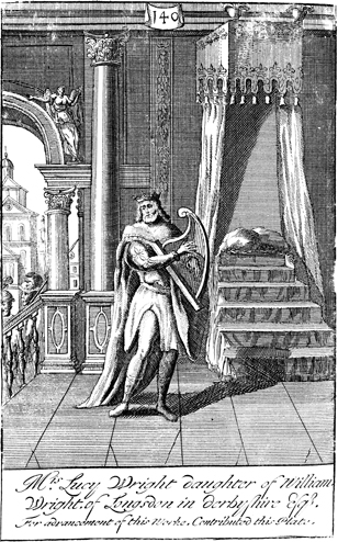 Description: David is depicted as the Psalmist with harp in hand. As the numeral at the head of the page indicates, this is plate #140 in a series of illustrations.