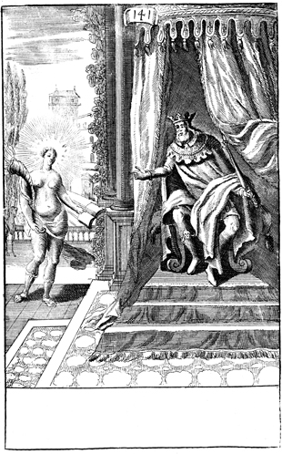 Description: King Solomon is depicted as the author of the wisdom literature with Lady Wisdom nearby. As the numeral at the head of the page indicates, this is plate #141 in a series of illustrations.