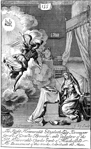 Description: The angel Gabriel visits Mary and announces that she will give birth to Jesus. The names of the artist, G. Freman, and the engraver, Johannes Kip (1653-1722), have been set at the base, and as the numeral at the head of the page indicates, this is plate #155 in a series of illustrations.
