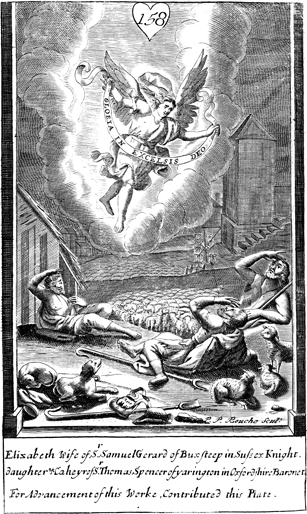 Description: An angel tells shepherds of the birth of Jesus. As the numeral at the head of the page indicates, this is plate #158 in a series of illustrations, and the name of the engraver, Peter Paul Bouche (b. ca. 1646), has been set at the base.