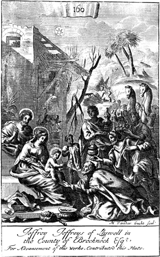 Description: The magi bring gifts of gold, frankincense, and myrrh to the newborn king. The name of the engraver’s name, Michael van der Gucht (1660-1725), has been set at the foot, and as the numeral at the head of the page indicates, this is plate #160 in a series of illustrations.