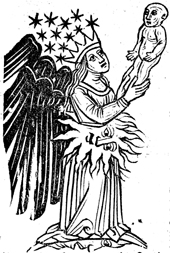 Description: An angel with a crown on her head, stars above, and sun at side holds up on infant.