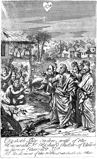 Description: Jesus heals ten lepers. As the numeral at the head of the page indicates, this is plate #184 in a series of illustrations, and the name of the engraver, Peter Paul Bouche (b. ca. 1646), has been set at the base.