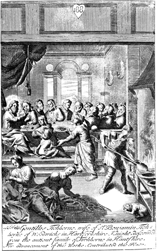 Description: Martha works as Mary listens to Jesus. As the numeral at the head of the page indicates, this is plate #188 in a series of illustrations, and the name of the engraver, Peter Paul Bouche (b. ca. 1646), has been set at the base.