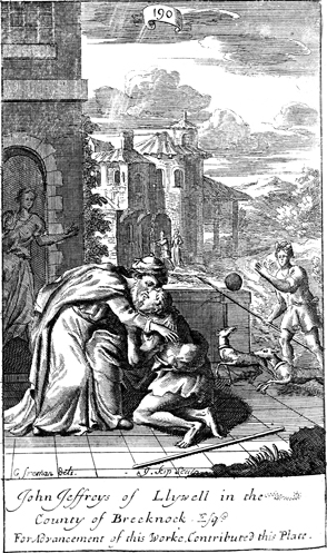 Description: The father embraces his son upon his return home. The names of the artist, G. Freman, and the engraver, Johannes Kip (1653-1722), have been set at the base, and as the numeral at the head of the page indicates, this is plate #190 in a series of illustrations.