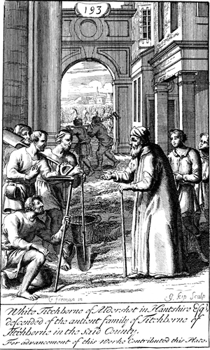 Description: Those who worked the longest complain about being paid the same amount as those who worked only for an hour. The names of the artist, G. Freman, and the engraver, Johannes Kip (1653-1722), have been set at the base, and as the numeral at the head of the page indicates, this is plate #193 in a series of illustrations.