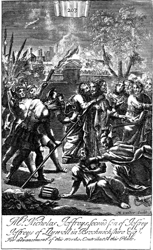 Description: Judas identifies Jesus to his captors with a kiss; Peter strikes Malchus with his sword. The name of the engraver’s name, Michael van der Gucht (1660-1725), has been set at the foot, and as the numeral at the head of the page indicates, this is plate #203 in a series of illustrations.