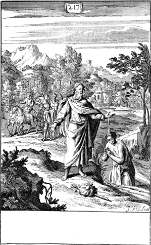 Description: Phillip baptizes the Ethiopian Eunuch. The name of the engraver, Johannes Kip (1653-1722), has been set at the base, and as the numeral at the head of the page indicates, this is plate #217 in a series of illustrations.