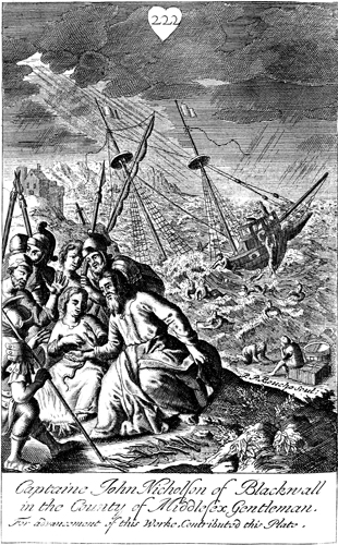 Description: Paul is bitten by a viper on the shore of Malta, after a shipwreck depicted in the background. As the numeral at the head of the page indicates, this is plate #222 in a series of illustrations, and the name of the engraver, Peter Paul Bouche (b. ca. 1646), has been set at the base.