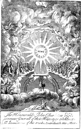 Description: John's vision of the heavenly throne room. God’s presence has been indicated by placing the Tetragrammaton in an illuminated cloud. As the numeral at the head of the page indicates, this is plate #224 in a series of illustrations.