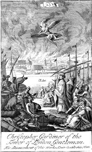 Description: Two angels drop a giant millstone, as Babylon (Rome) burns in the background. The name of the engraver, Johannes Kip (1653-1722), has been set at the base, and as the numeral at the head of the page indicates, this is plate #232 in a series of illustrations.