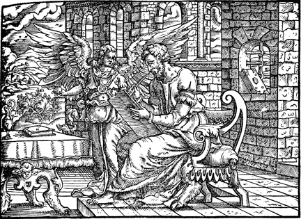 Description: Matthew writes his gospel with his attribute, the angel, nearby.