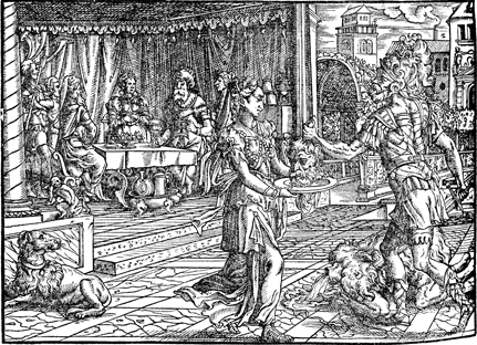 Description: The head of John the Baptist is presented on a silver platter to Herodius and her mother, as requested.