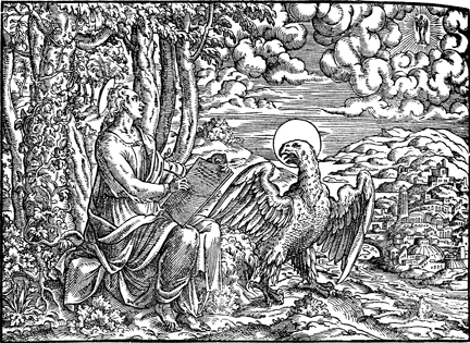 Description: John writes his gospel with his attribute, the eagle, nearby.