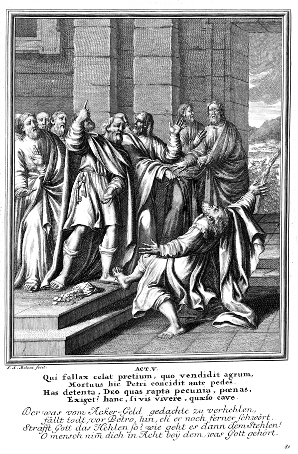 Description: Ananias dies after attempting to hold money back from the community in deceit.