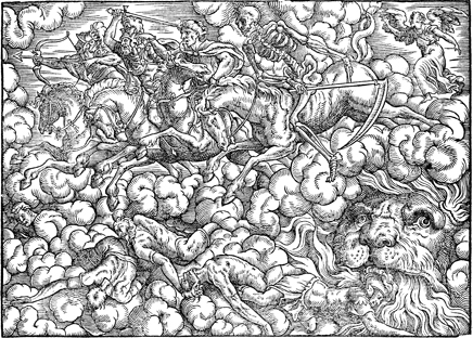 Description: After the first four seals are opened, four horsemen roam the earth bringing great calamity. They are shown carrying a bow, a sword, scales, and a scythe.