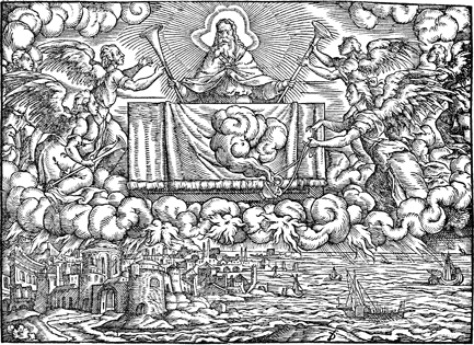 Description: Upon the opening of the seventh seal, angels are given seven trumpets, while another pours out a golden censor upon the earth.