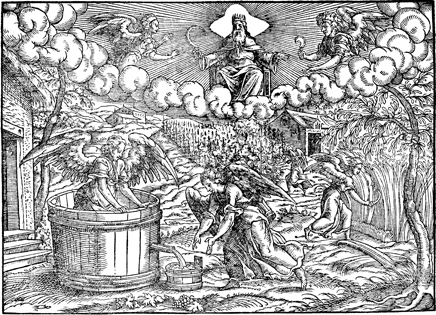 Description: The angels gather the harvest at the end of the age, as God looks on with pruning hook in hand.