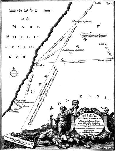 Description: A map of Philistia with David standing victorious over Goliath the champion of Gath.