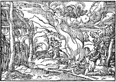 Description: God, enthroned upon the clouds, prefers his brother’s offering of the first fruit of his flock (foreground) over that of Cain’s first fruit of the ground.