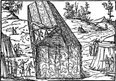 Description: The tabernacle frame and view of the interior of the tabernacle with ritual objects inside.