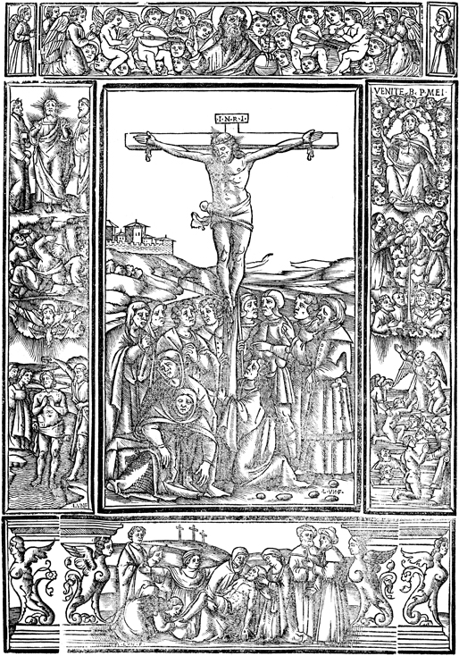 Description: An image of the crucifixion is surrounded by a border depicting several New Testament scenes including the transfiguration, Jesus' baptism, the second coming, and Jesus' burial.