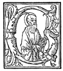 Description: An initial letter G with the Apostle Paul holding his attribute, a sword.