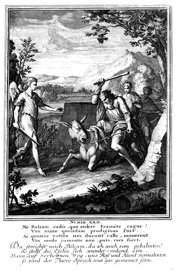 Description: Balaam beats his donkey for stopping as an angel stands in its way with sword raised.