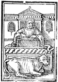 Description: Saint Luke writes his gospel with his attribute, the bull, nearby.