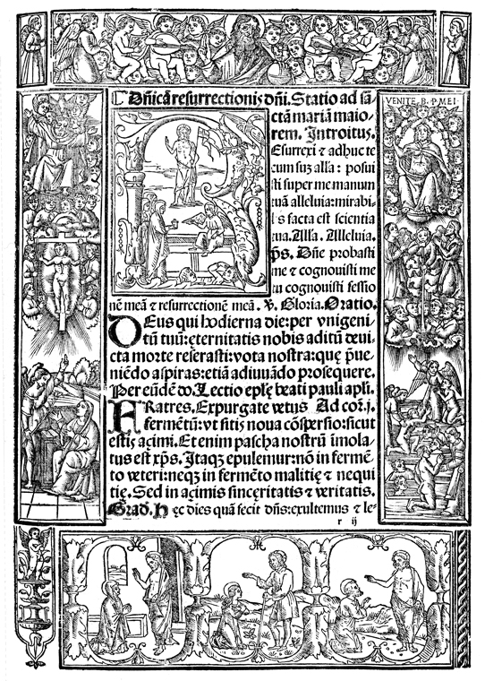 Description: This historiated page border depicts the resurrection of Jesus Christ surrounded by several New Testament images including the annunciation, the second coming, and three post-resurrection appearances.