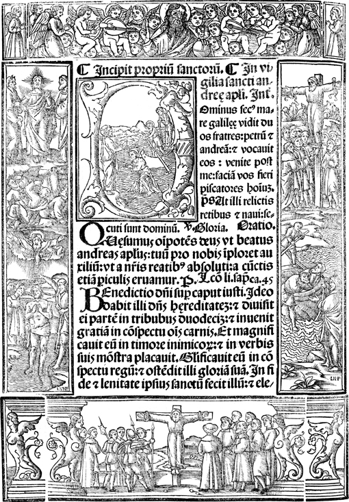 Description: This historiated page border illustrates various scenes from Jesus' life including the baptism of Jesus (bottom, left); calling of the first disciples (bottom, right); the transfiguration (top, left); and the crucifixion (top, right). The head of the border depicts Jesus enthroned and holding the globus cruciger while surrounded by worshipping angels and cherubim. At the bottom is another depiction of the crucifixion. Finally, the initial letter D features Peter walking on water.