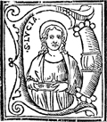 Description: An initial letter D with Saint Lucia holding her attribute, her eyes..