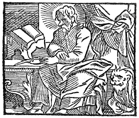 Description: St. Mark writes his gospel with his attribute, the lion, nearby.