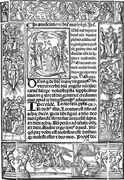 Description: This historiated page border depicts an initial letter D with the annunciation surrounded by a border depicting a collection of New Testament scenes including the transfiguration, the baptism of Jesus, and two additional renderings of the annunciation.