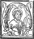 Description: An initial letter N with Saint Bartholomew and his attribute, the flaying knife.