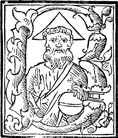 Description: An initial letter B features the Trinity as a three faced being. The figure holds the globus cruciger in hand, while the symbol for the Trinity (a triangle) is placed behind their head.