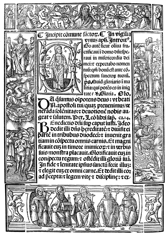 Description: This historiated page border depicts an initial letter A with Apostle James the Greater surrounded by several New Testament images including the crucifixion, the Apostle Peter walking on water, Jesus' baptism, and the transfiguration; in addition, several images of Popes are depicted.