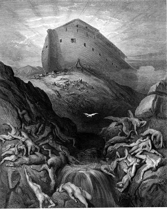 Description: The dove is sent forth from the ark to look for dry ground; the mountain is littered with dead bodies as the ark rests on Mt. Ararat. The artist, Gustave Doré (1832-1883), has placed his signature at the lower left of the woodcut.