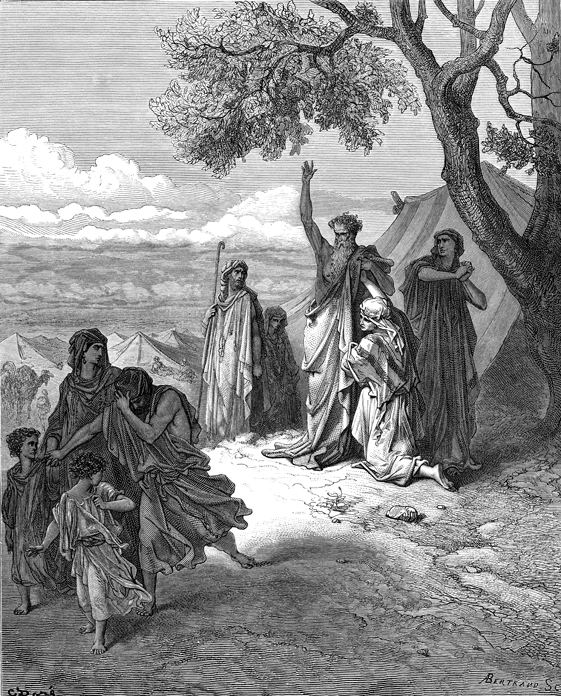 Description: Noah, with Shem and Japheth by his side, curses Ham after discovering that he has seen him naked. The artist, Gustave Doré (1832-1883), has placed his signature at the lower left of the woodcut, and the engraver’s signature, Antoine Valérie Bertrand, is located at the lower right.