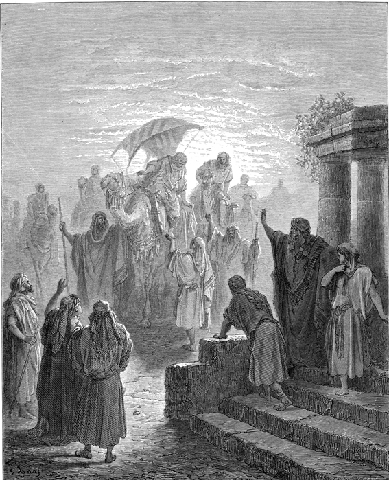 Description: Isaac and Rebekah meet for the first time, while many others gather around to celebrate this occasion. The artist, Gustave Doré (1832-1883), has placed his signature in the lower left corner of the woodcut, and the engraver’s signature, Trichon Monvoisin, is located in the lower right.
