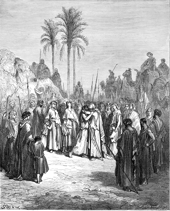 Description: Esau’s men and Jacob’s family witness the brothers’ reconciliation. The artist, Gustave Doré (1832-1883), has placed his signature at the lower left of the woodcut, and the engraver’s signature, L. Dumont, is located at the lower right.