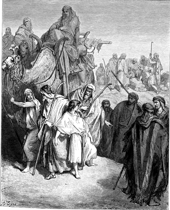 Description: After lifting Joseph out of the cistern, Joseph’s brothers negotiate with the Ishmaelites to sell him for twenty shekels of silver. In the background (left), one of Joseph’s brothers suggests dipping his coat in goat’s blood and taking it back to their father. The artist, Gustave Doré (1832-1883), has placed his signature in the lower left corner of the woodcut, and the engraver’s signature, W. Thomas is located in the lower right corner.
