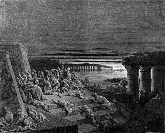 Description: A plague of intense darkness covers Pharaoh’s house and all the land of Egypt for three days. The artist, Gustave Doré (1832-1883), has placed his signature at the lower left of the woodcut, and the engraver’s signature, Adolphe François Pannemaker (1822-1900), is located at the lower right (the hyphenated addition to “Pannemaker” may note that this was a combined effort with A. Ligny).