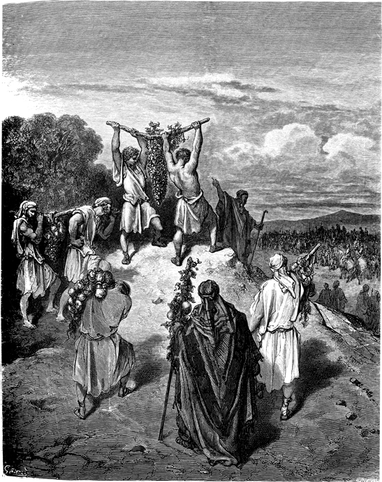 Description: Joshua and Caleb return from the exploration of Canaan and report to Moses of its abundance, indicated by the large size of the grape clusters they bear. The artist, Gustave Doré (1832-1883), has placed his signature at the lower left of the woodcut, and the engraver’s signature, Hurel, is located at the lower right.