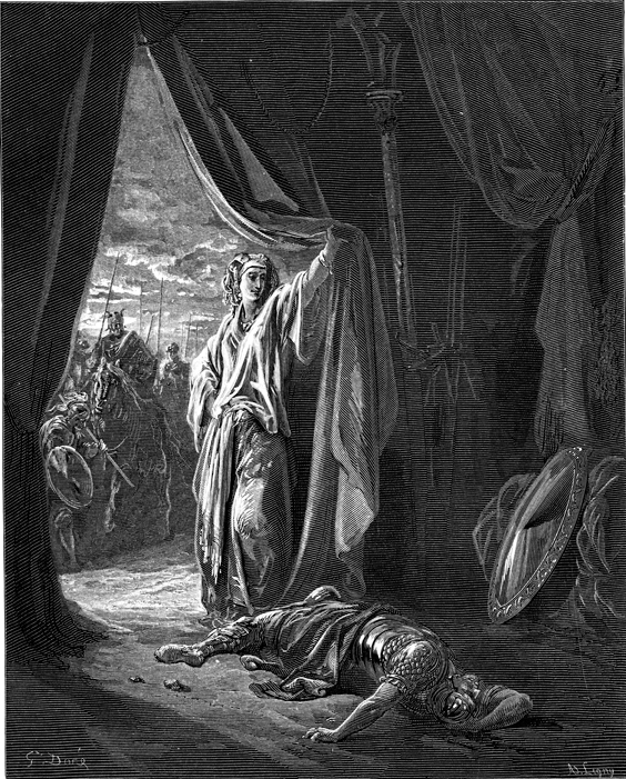 Description: Jael shows Balak that she has killed Sisera. The artist, Gustave Doré (1832-1883), has placed his signature at the lower left corner, and the engraver’s signature, A. Ligny, is located at the lower right corner of the woodcut.