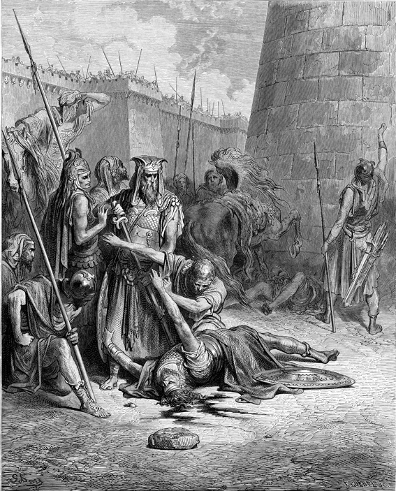Description: Abimelech lies on the ground dead after being struck by a rock from the tower above. The artist, Gustave Doré (1832-1883), has placed his signature at the lower left of the woodcut, and the engraver’s signature, E. Goebel, is located at the lower right.