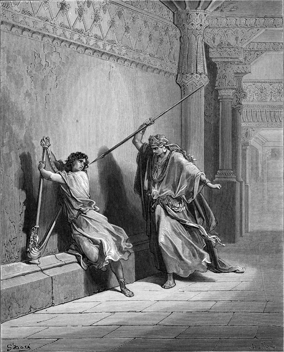 Description: Saul attempts to pin David to the wall with a spear. The artist, Gustave Doré (1832-1883), has placed his signature at the lower left of the woodcut, and the engraver’s signature, A. Ligny, is located at the lower right.