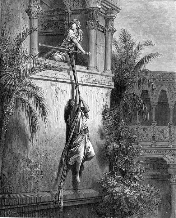 Description: Michal lowers David through a window, while Saul’s guards attempt to kill him in his sleep. The artist, Gustave Doré (1832-1883), has placed his signature at the lower left of the woodcut, and the engraver’s signature, Adolphe François Pannemaker (1822-1900), is located at the lower right.