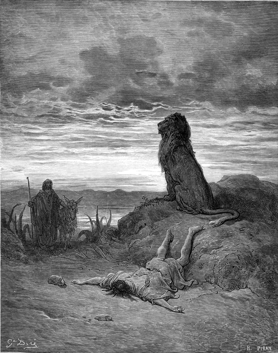 Description: The man of God is killed by a lion for failing to obey God's command. The artist, Gustave Doré (1832-1883), has placed his signature at the lower left of the woodcut, and the engraver’s signature, Héliodore Pisan (1822-1890), is located at the lower right.